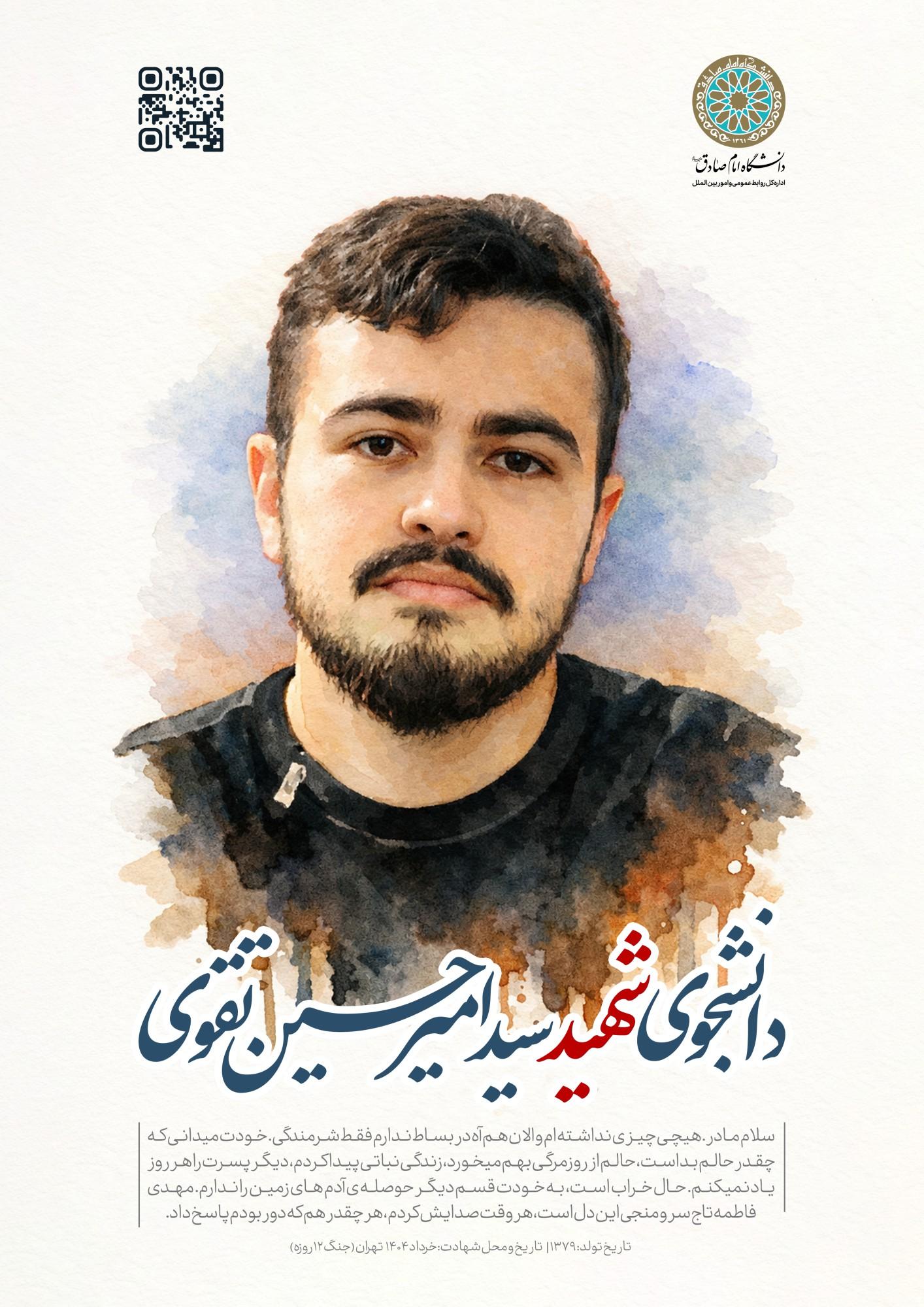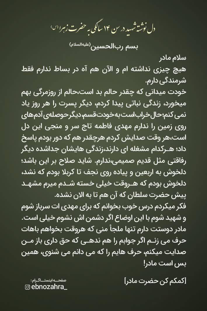 نامهِ شهید سید امیرحسین تقوی [ از دانش آموزان دبیرستان پیام غدیر که در جنگ ۱۲ روزه به شهادت رسید ] در سن١٤سالگی [ پایه هشتم ] به محضر حضرت زهرا(س)