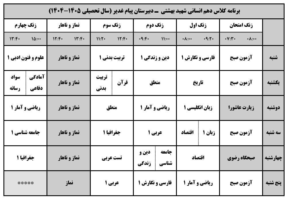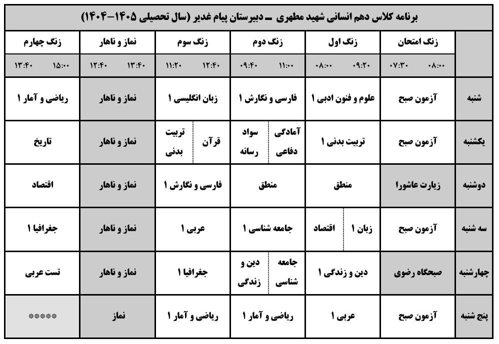برنامه کلاسی پایه دهم انسانی و معارف